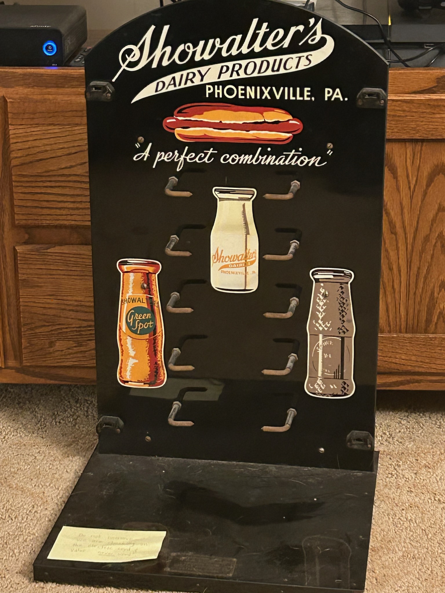 The display stands about two feet tall. It has a switch and a potential power unit to heat up. The cord is missing. The idea was that a hungry customer would heat his hot dog on one of the five pairs of heating spikes. They would then purchase a Showalter’s milk, Green Spot Orangeade or Showalter’s chocolate milk and enjoy!